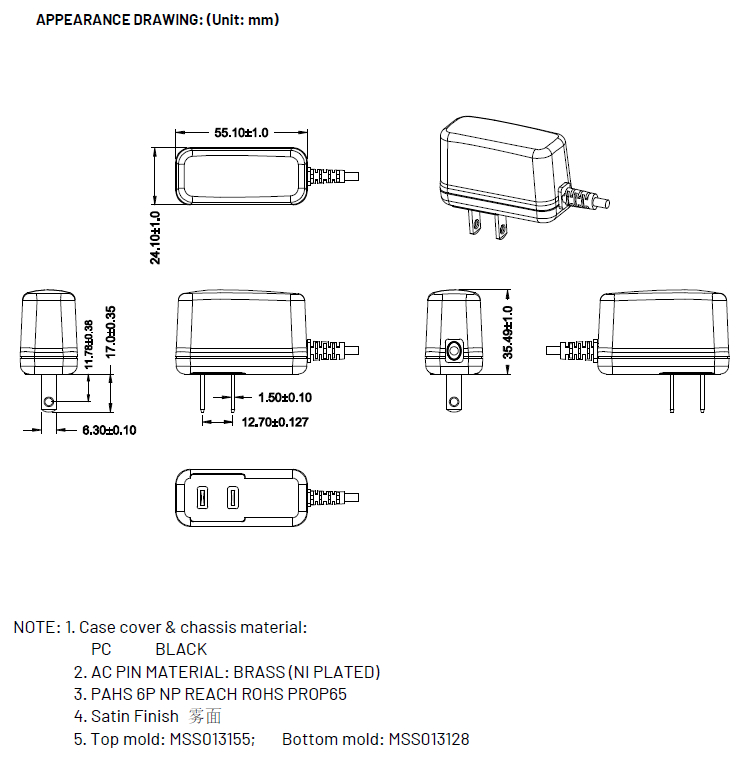 外観寸法 | US Plug / JP Plug:L 56 x W 43 x H 59 (mm) EU Plug:L 56 x W 28 x H 79 (mm) UK Plug:L 56 x W 49 x H 71 (mm) AU Plug:L 56 x W 41 x H 68 (mm) |
