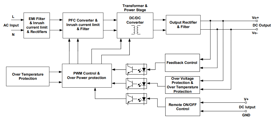 | 過負荷/過電流 | >201% of rated load current, Hiccup Mode, Non-Latching (Auto-Recovery) |